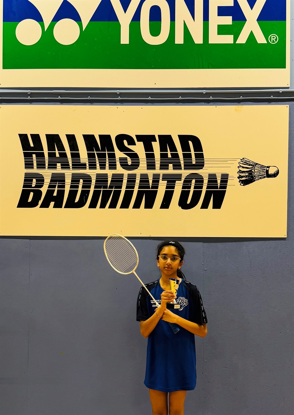 På bilden ser vi Aadhya, som riktade in sig på tävlingen i Halmstad där hon tog sig hela vägen till ännu en final i damsingel nivå 3!
